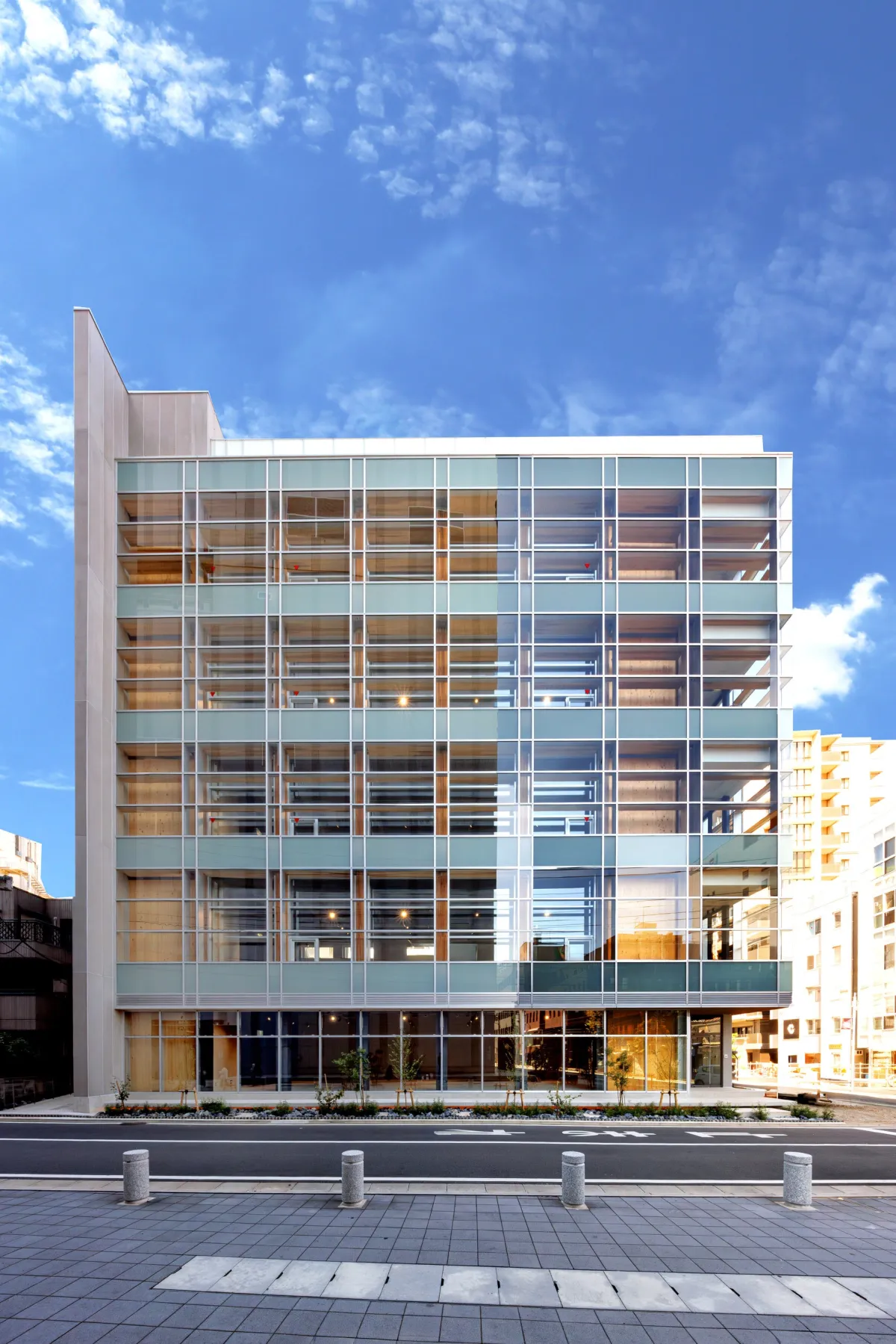 この5階建てテナントビルは、大宮駅東口からわずか徒歩5分の場所に位置しています。鉄骨造にCLTパネルを耐震壁として組み込み、しっかりとした耐震性を持ちながらも、木質の特性を活かした外観が魅力的です。特に、南側の道路に面したCLT耐震壁は、現し仕上げとなっていて、周囲の鉄骨造やRC造の建物と調和しつつ、木の温もりを感じられるデザインとなっています。