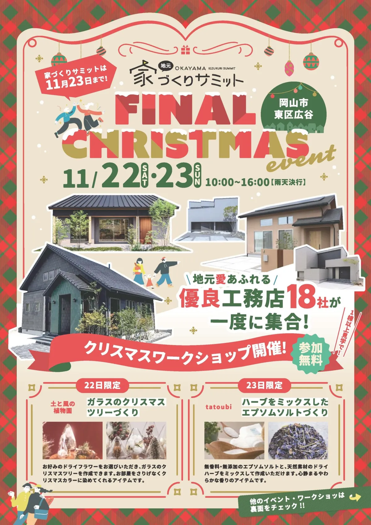 2025年11月23日、岡山の『家づくりサミット』がついにその幕を閉じようとしています。これまで多くの方々にご愛顧をいただき、感謝の気持ちを込めて、11月22日(土)と23日(日)の二日間に渡って『FINAL CHRISTMAS EVENT』が開催されます。