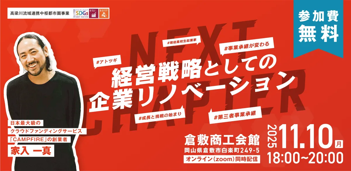 2025年11月10日(月)、岡山県倉敷市にて、事業承継を再定義し、成長と挑戦の始まりと捉える新しい視点のセミナーが開催されます。本セミナーは、オープンネーム事業承継「relay(リレイ)」を運営する株式会社ライトライトと倉敷市、倉敷商工会議所、株式会社日本政策金融公庫 倉敷支店との連携により実現しました。