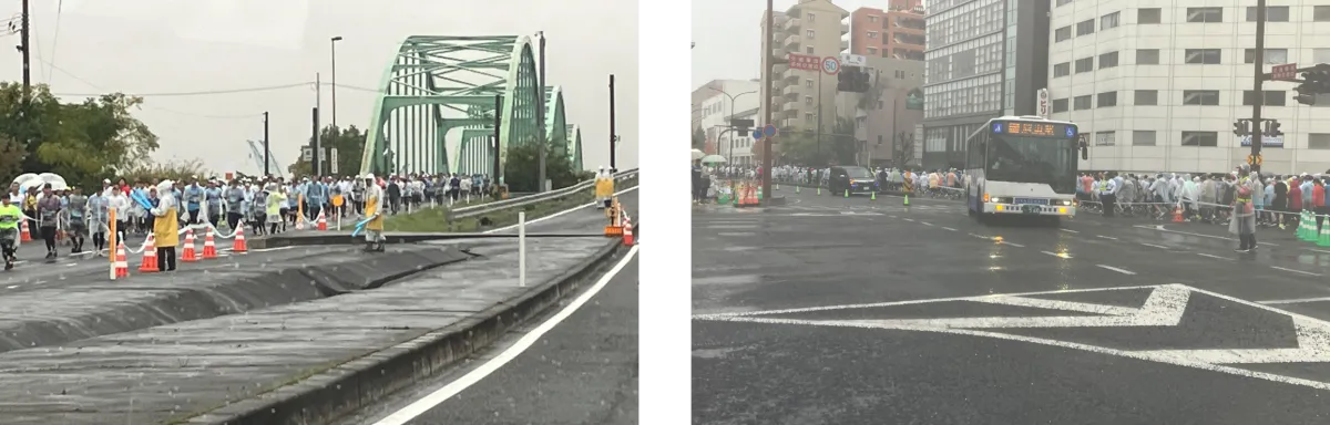 日本管財の警備計画では、分単位で設けられた11の関門の運営が重要なポイントです。この関門では、ランナーの流れをスムーズにするための詳細なシステムが組まれています。また、雨天時にあたる大会当日には、JR岡山駅などの交通機関利用者とランナーの動線整理や、観光客と応援者の共存を図るための混雑対策も行われました。