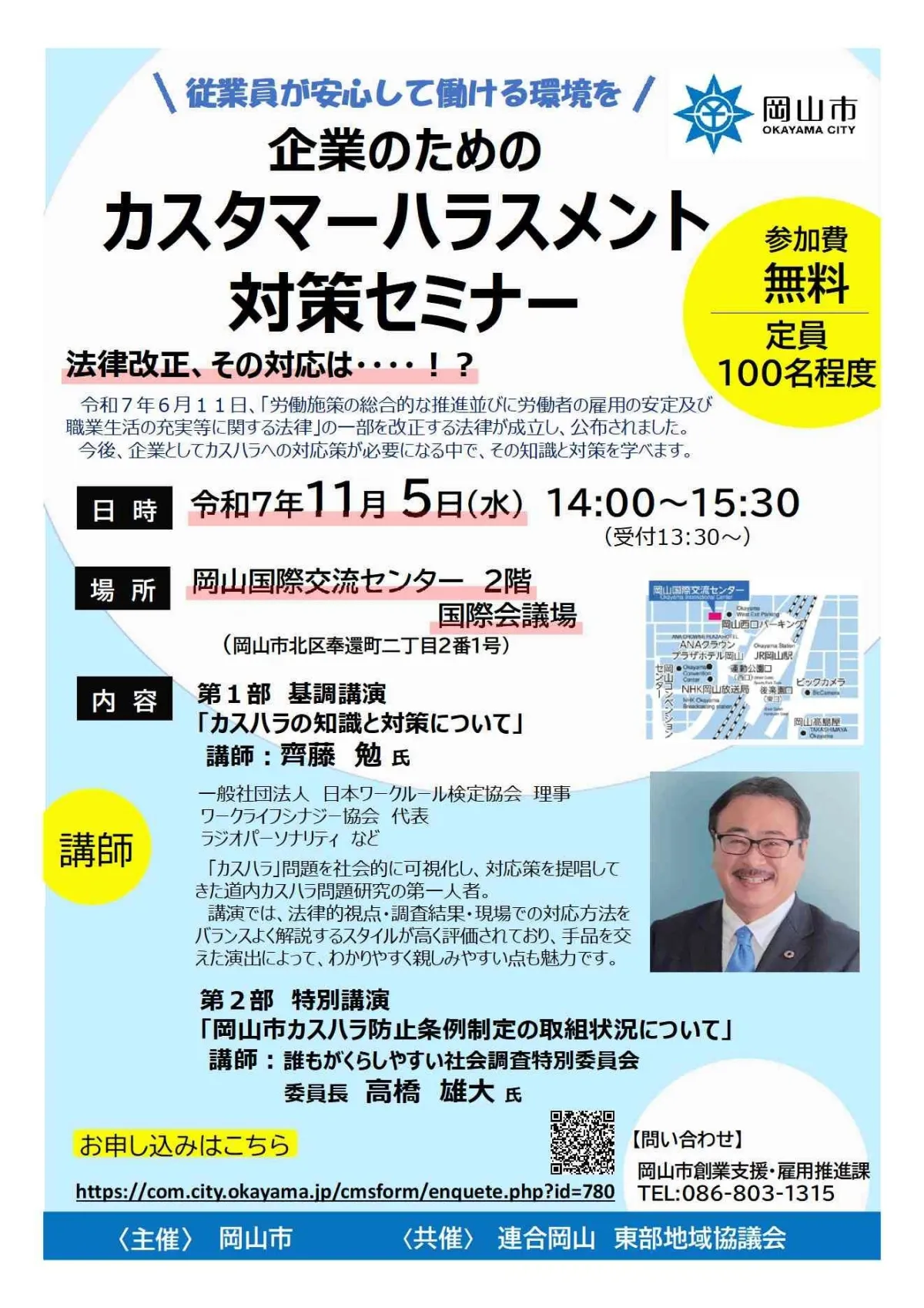 参加者の皆様は、カスハラに関する基本的な知識だけでなく、実際にどのように対応すれば良いのか、岡山市の具体的な取り組み事例についても学ぶことができます。カスハラ問題は、企業にとって無視できない課題となっています。この機会にぜひ、知識を深め、具体的な対策を考えるきっかけをつかんでいただきたいと思います。