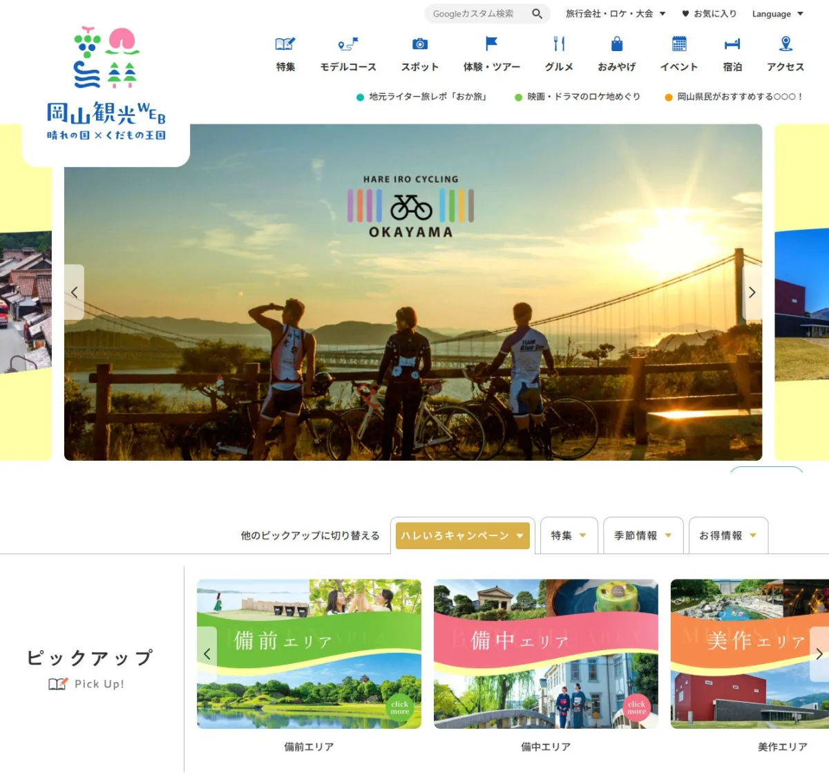 新しい「岡山観光WEB」には、旬のおすすめ特集や地元ライターによる体験記事、岡山ならではの体験プログラムやモデルコース、さらには観光スポット、イベント情報、グルメ、宿泊情報など、観光に必要な情報が網羅されています。旅行を考えている方はぜひ訪問して、新しい岡山の魅力を発見しましょう。